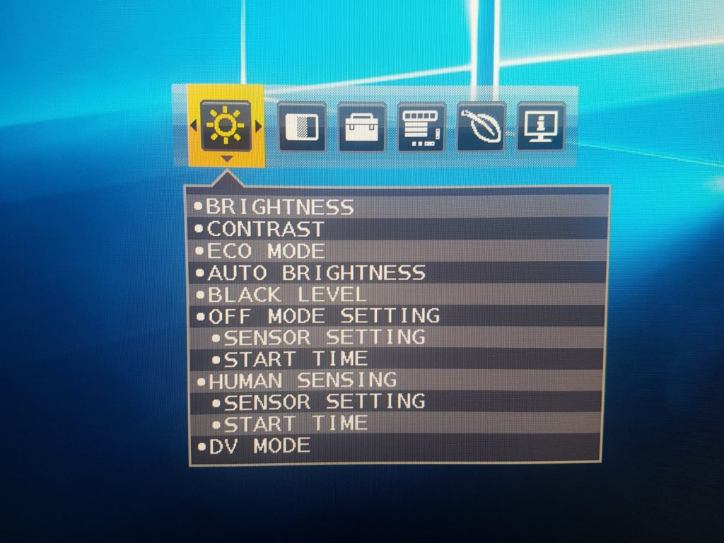 Poza standardowymi ustawieniami dostępnych w każdym monitorze mamy tutaj ECO MODE, funkcja ta odpowiada za dostosowanie jasności i kontrastu do panującej w pokoju jasności i naszej odleglłości od monitora. W przypadku oddalenia się od niego monitor się przygasza. ECO MODE ma zadbać o zasobność naszej kieszeni, zdrowie oczu i oczywiście naszej planety. Mamy dwa tryby, które umożliwiają dostosowanie ekologiczności naszego monitora do naszych potrzeb.